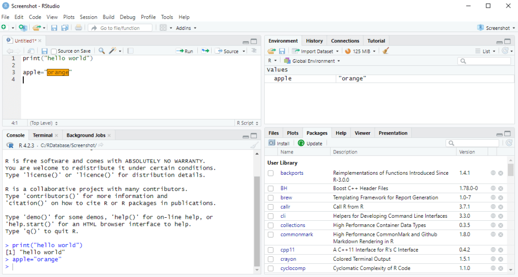 - File/Plot/Package/Help – Different functionality like viewing file in explorer, help documentation of script, Cran list of library.