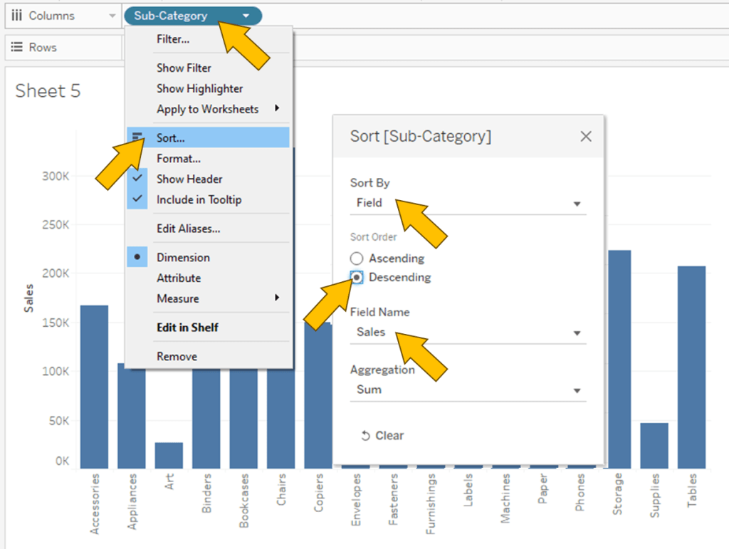 4. In the Sort Menu, Change to Sort by Field, Sort Order Descending and Field Name is Sales.