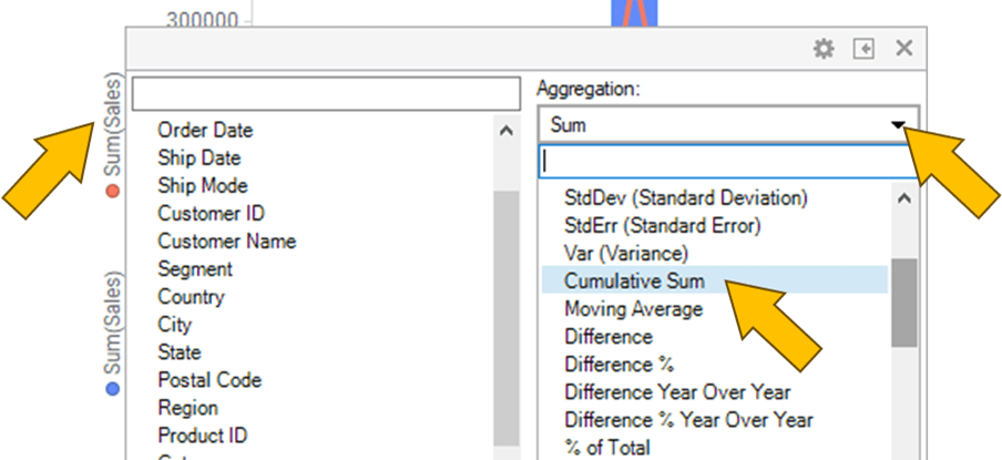 6. Click on “Sum(Sales)” on the X Axis, change Aggregation to Cumulative Sum