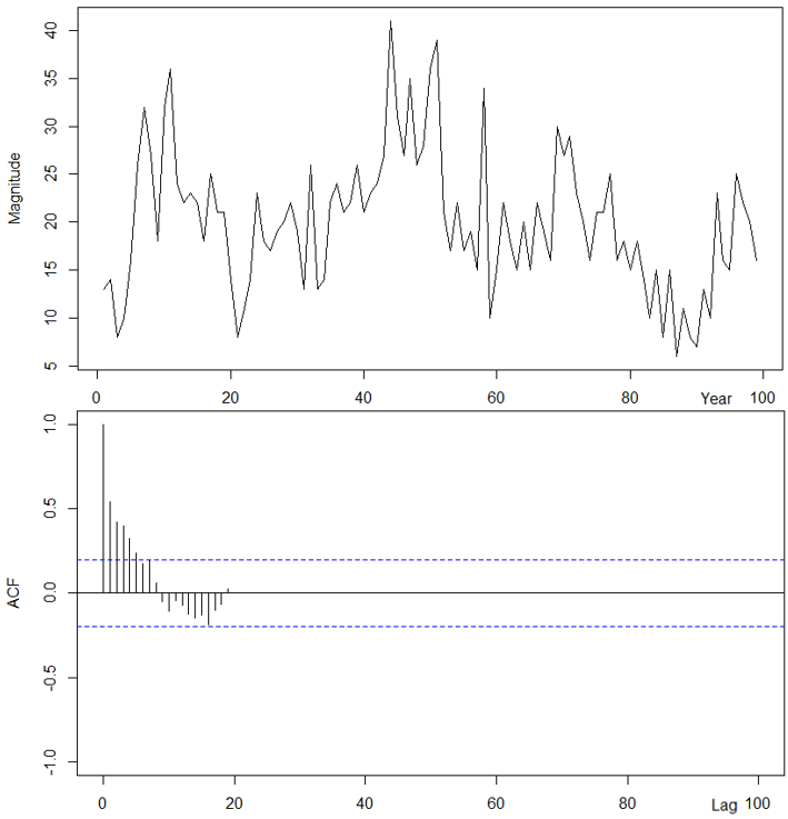 In a previous class, “imported_earthquakes” had been visualized for time series plot. Using the same dataset, and the autocorrelation function (acf) was applied to assess stationarity.