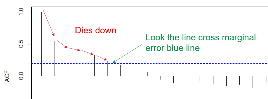 Sometime, “dies down” are hard to be identify using human justification; Therefore “adf” test. Before heading to “adf”, we must understand what ACF plot was doing.