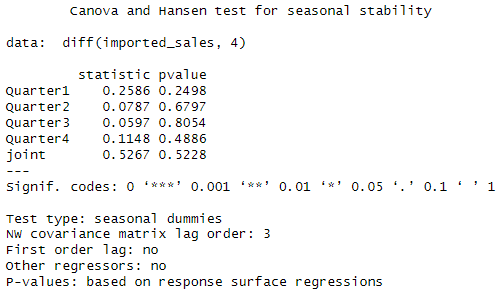 Earlier class, “imported_sales” show there are some quarterly seasonality signal.
