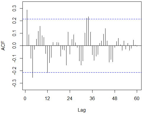 Acf(imported_beerproduction, lag.max=60)![]() | Acf(diff(imported_beerproduction, 12), lag.max=60)![]() |