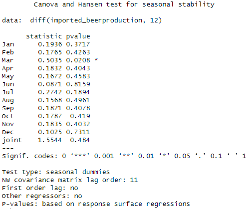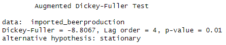 adf.test(imported_beerproduction)![]() Note that although adf test show p-value = 0.01, the seasonality stationary failed. | adf.test(diff(imported_beerproduction, 12))![]() |