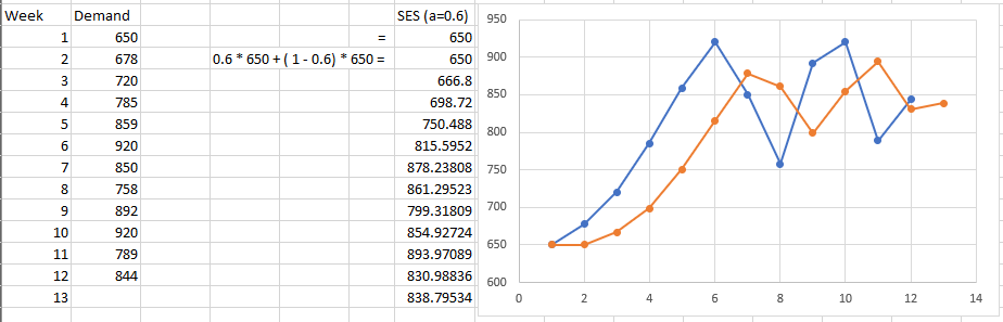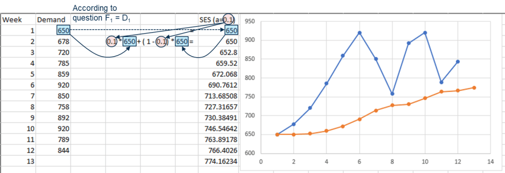 ps. Procedure for continually revising a forecast in the light of more recent experience, backward propagation. If alpha = 1, that means fully rely on previous value; aka naive forecast.