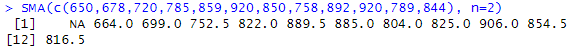 SMA(c(650,678,720,785,859,920,850,758,892,920,789,844), n=2)