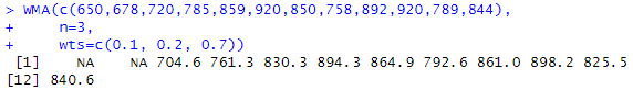 WMA(c(650,678,720,785,859,920,850,758,892,920,789,844),