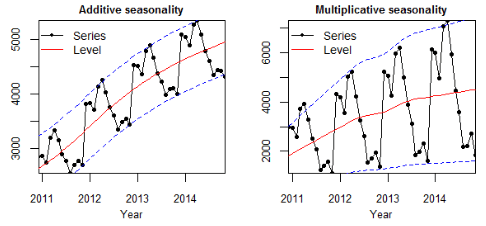 | a time series with constant variability | a time series with variability increasing with trend |