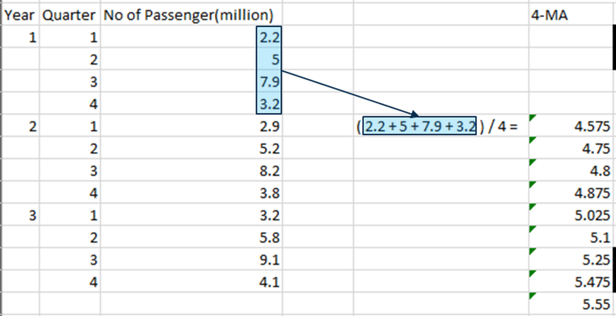 Step 2. Calculate CMA (center moving average) from 4-MA. Note that this is actually forming the “Trend Component”.