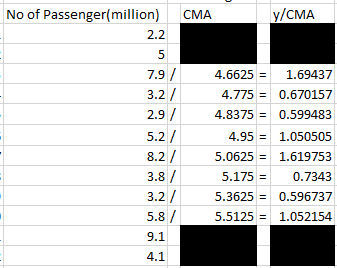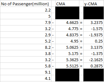 Step 3. Calculate y-CMA. Note. this part means that seasonal component are independent from each other, vary around 0 (i.e: trend-cycle will not cause an increase in the magnitude of seasonality).
