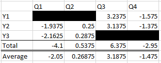 Step 5. Perform total and using it to formulate average. Note that average in this scenario was divided by 2 as each column only has 2 value. DO NOTE put zero in Y1Q1, Y1Q2, Y3Q3, Y3Q4.