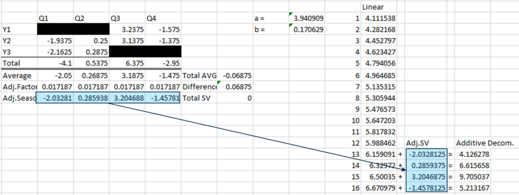 Step 6. Check if total of average are equal to zero, compensate if not. Note that this is actually forming the “Seasonal Component”.
