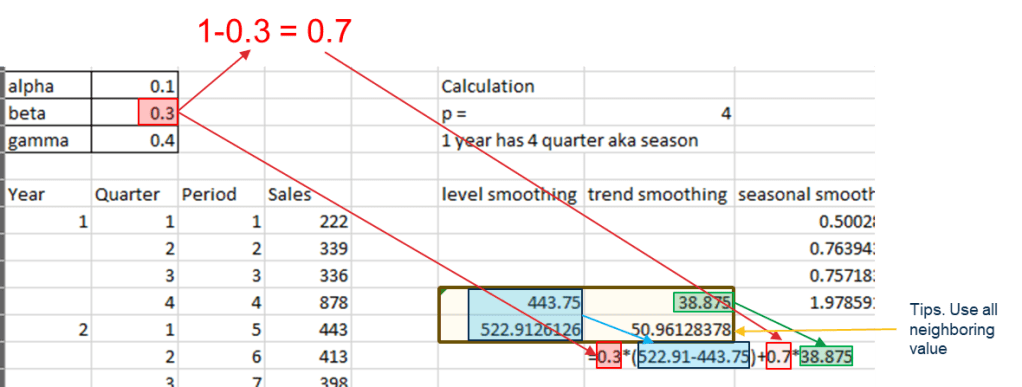 - beta = trend smoothing constant