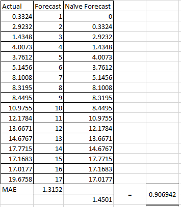 MAE / MAE of (eg. k-step ahead naive forecast)