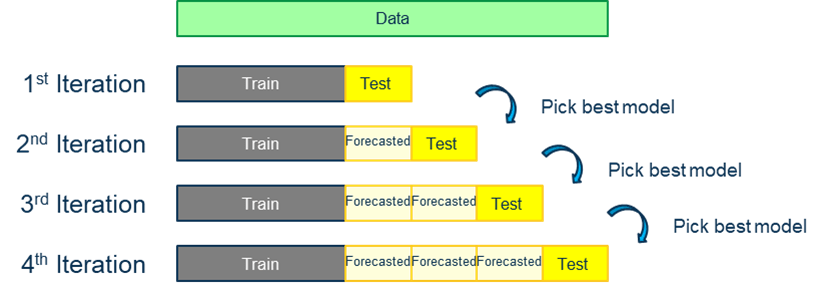 Unlike typical cross validation where “test” is the smallest subset and train will be the remaining set; CV for time series “train” could be the smallest subset. Small portion of data (must according to time sequence) is elected for “train” subset. Models trained and forecasted value will be used in next iteration of model train/selection until all data is fully utilized.