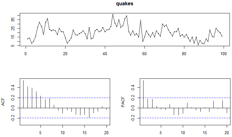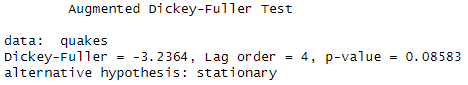 Boom! ndiffs show the quakes time series is stationary but adh test show otherwise. Here I keep a suspense later to be discuss.