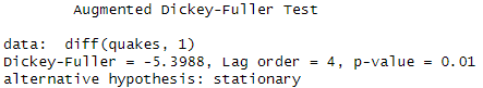 Since the quakes time series is not stationary confirmed by both test, we need to “station” it.