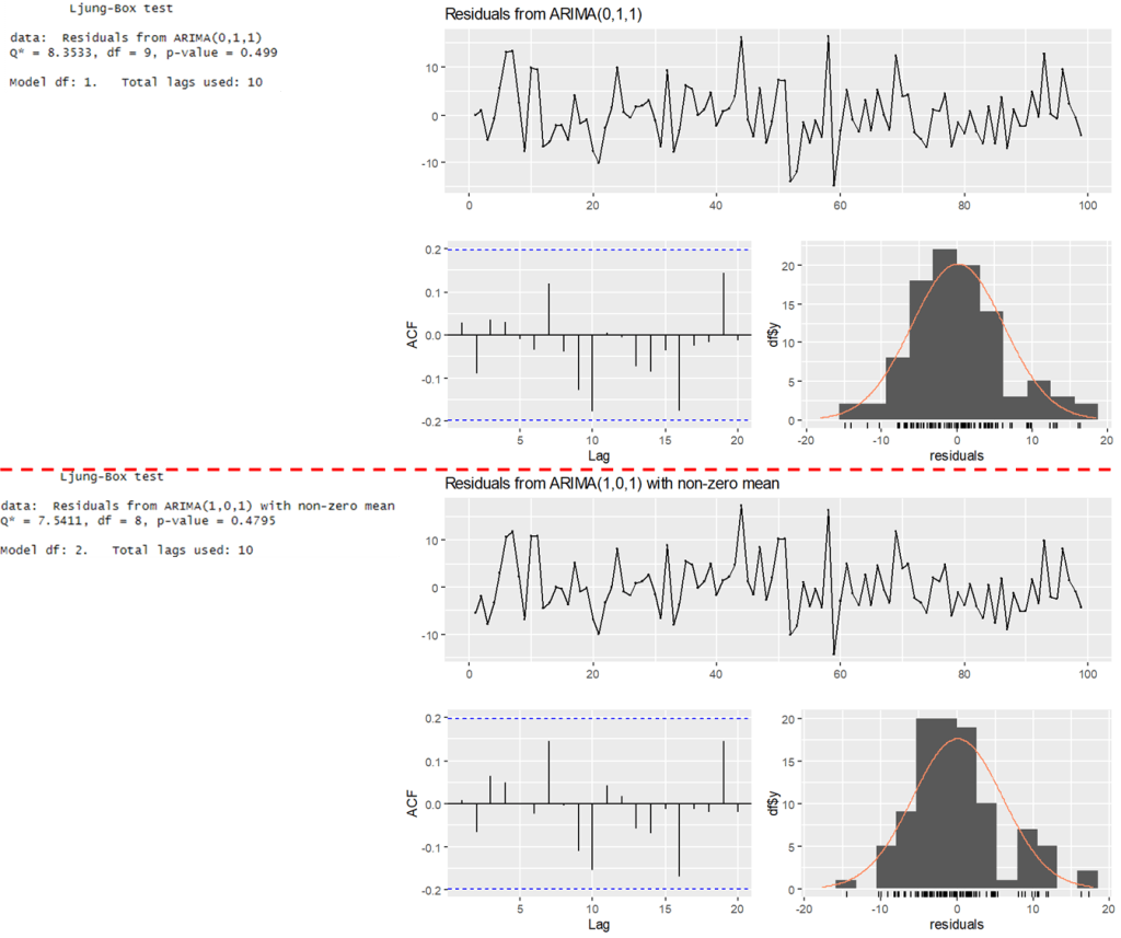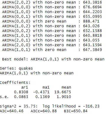Auto.arima is a tool that compute possible hyperparameter that best predict the quakes time series. Earlier, we had been using ARIMA(0, 1, 1) and now lets train another model with ARIMA(1, 0, 1).