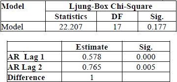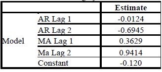Yt = -0.12 – 0.0124Yt-1 – 0.6945Yt-2 + εt + 0.3629εt-1 + 0.9414εt-2