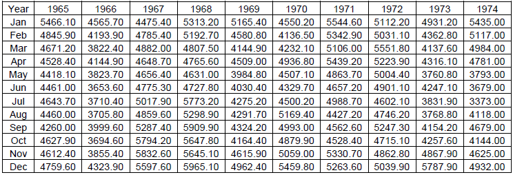 Table below contains a time series for monthly values of average weekly total investments at large New York City Banks, 1965 – 1974 (millions of dollars). Using a computer program for SARIMA modeling, obtain a plot of the data, the sample autocorrelations, and the sample partial autocorrelations. Develop an appropriate SARIMA model, and generate forecasts for the first three months of the year 1975.