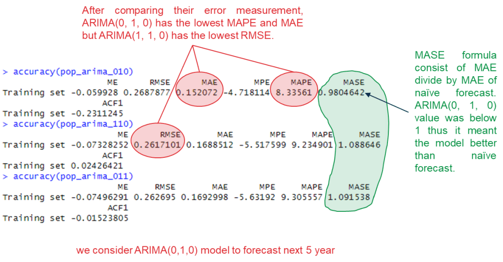 (d) After a satisfactory model has been found, forecast the average growth of population for the next 5 years. How does your forecast differ from the naïve forecast.