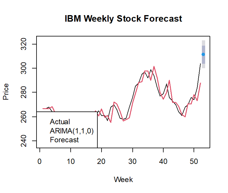 (e) After a satisfactory model has been found, forecast the IBM stock price for the first week of January of the next year. How does your forecast differ from the naïve forecast, which says that the forecast for the first week of January is the price for the last week in December (current price)?