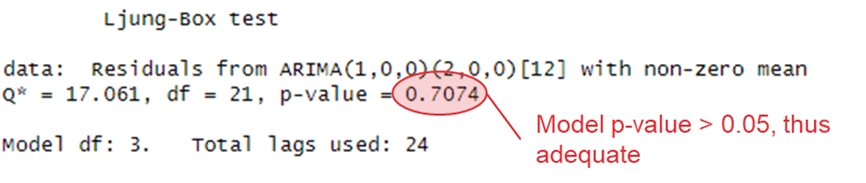 According to Ljung-Box test. P-value = 0.177 > 0.05. The model is adequate.