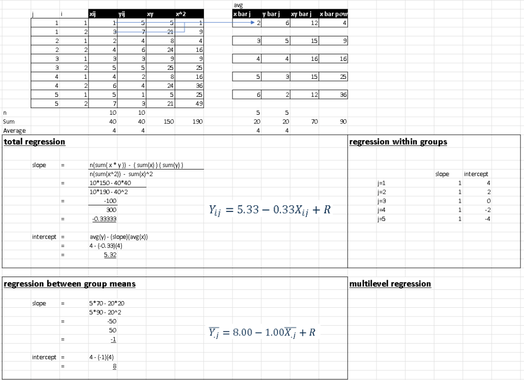 Total Regression, Regression between group means, Regression within groups, Multilevel Regression