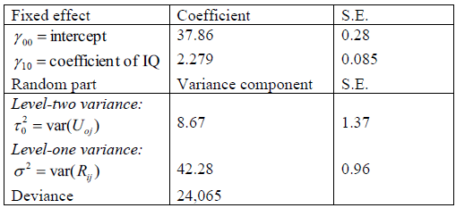 As a variable at the student level that is essential for explaining English score, we use the measure for IQ taken from a study. The IQ score has been centered, so that its mean is 0. Its standard deviation in this data set is 2.84. This is calculated as a descriptive statistic, without taking the grouping into account. Given that also the standard deviation of English score is 8.56. The results are presented in the table
