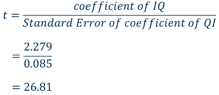 This t-value is extremely large, shows that the coefficient of IQ is highly significant. Therefore IQ has a statically significant effect on English Score.